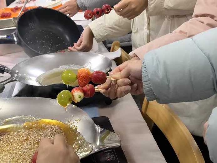 现场围绕“三暖”核心,设置“暖手”“暖胃”两大手工体验区。同学们在志愿者与后勤团队的协助下,亲手包制寓意团圆的饺子、熬煮醇香手工奶茶、串制晶莹剔透的冰糖葫芦。从茶乳交融的甜蜜,到面皮包裹的祝愿,再到糖浆凝固的脆甜,大家在动手创作中沉浸式体验着传统文化的温度与情感。当热腾腾的饺子出锅,搭配亲手制作的糖葫芦与奶茶,满足与欢笑也随香气弥漫至每个人心中。