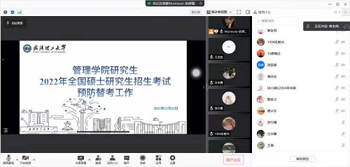研究生2022年全国研究生招生考试防替考工作大会的线上会议,各班班长作为代表参加此次会议。曾珠老师带领大家学习了关于防替考的相关资料后,将具体工作安排传达给各位班长。具体工作包括12月24日和25日晚进行全院的查寝工作;12月25日上午9: 00以班级为单位展开腾讯会议点名两项工作。