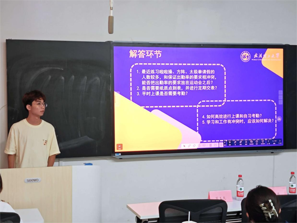 随后,会议集中解答了各班学委在工作中遇到的问题,进行了面对面答疑,以便日后的日常工作开展。各个学委积极提出问题,在场的老师、同学也耐心地给出答复。