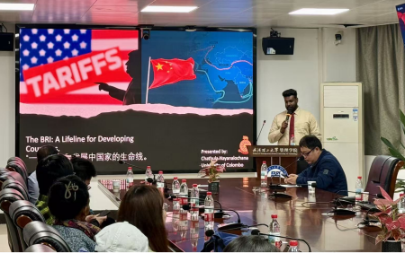 接着, Chathula教授围绕“'一带一路':发展中国家的生命线”主题解析了美国关税政策背后的经济逻辑,及外溢效应如何推动全球格局从单极向多极转变。在此背景下,“一带一路”倡议成为发展中国家应对外部冲击的重要战略抓手,通过缓解物流瓶颈、促进互联互通、加强南南贸易,助力各国实现出口多元化、提升经济韧性。