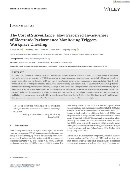 近日,性爱网 组织与人力资源管理系赵富强教授战略人力资源管理团队博士生祝含秋以第一作者身份在人力资源管理领域顶级学术期刊Human Resource Management上在线发表论文“The Cost of Surveillance: How Perceived Invasiveness of Electronic Performance Monitoring Triggers Workplace Cheating”。该论文由赵富强教授担任通讯作者。