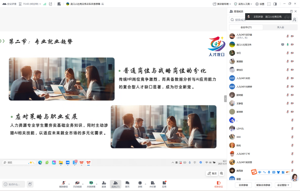 专项指导环节更是“接地气”、重实效。嘉宾结合案例,给出了“突出实践经历、量化成果数据”的简历优化秘诀,并传授了实用的面试沟通技巧,反复强调团队协作、有效沟通等软实力在职场中的重要性。互动答疑环节,同学们围绕“实习如何转化为就业优势”“人力专业跨行业发展的可能性”等现实问题踊跃提问,嘉宾逐一耐心解答,线上交流氛围热烈。同学们纷纷表示:“这次讲座就像一场及时雨,不仅理清了职业路径,更学到了马上能用上的简历和面试方法,心里有底多了。”