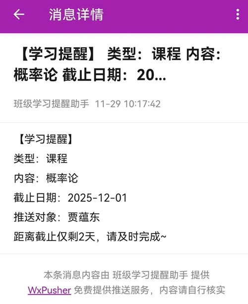 为落实“自我服务、互助提升”的理念,解决同学们日常学习中“作业截止遗忘、考试信息遗漏”的实际问题,2025年11月29日,营销2402班在博学主楼大厅及校园多处组织开展了学习信息精准推送服务活动,通过搭建基于WxPusher工具的班级学习提醒平台,为同学们提供课程作业、考试安排等信息的定时推送服务。