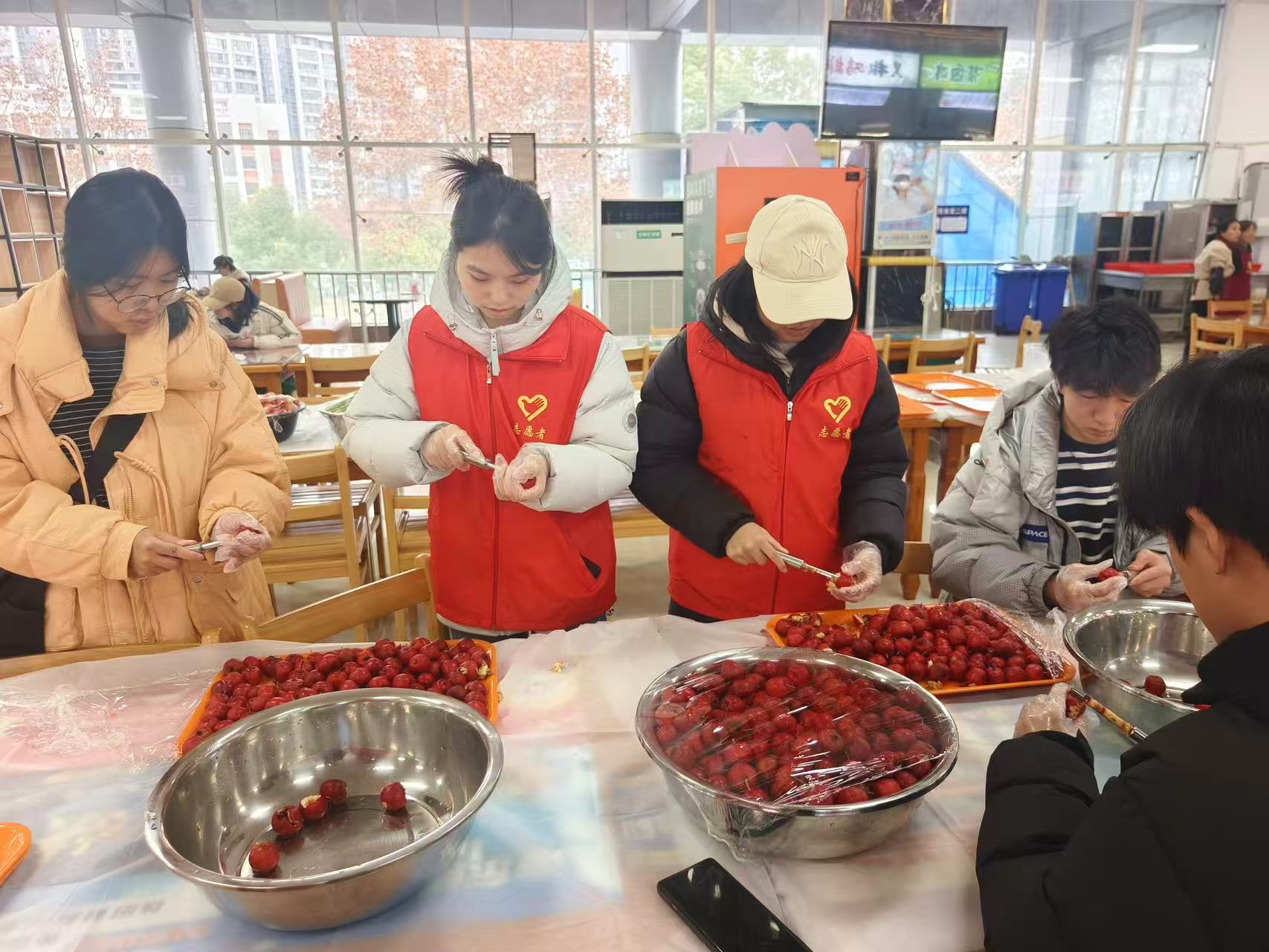 现场围绕“三暖”核心,设置“暖手”“暖胃”两大手工体验区。同学们在志愿者与后勤团队的协助下,亲手包制寓意团圆的饺子、熬煮醇香手工奶茶、串制晶莹剔透的冰糖葫芦。从茶乳交融的甜蜜,到面皮包裹的祝愿,再到糖浆凝固的脆甜,大家在动手创作中沉浸式体验着传统文化的温度与情感。当热腾腾的饺子出锅,搭配亲手制作的糖葫芦与奶茶,满足与欢笑也随香气弥漫至每个人心中。